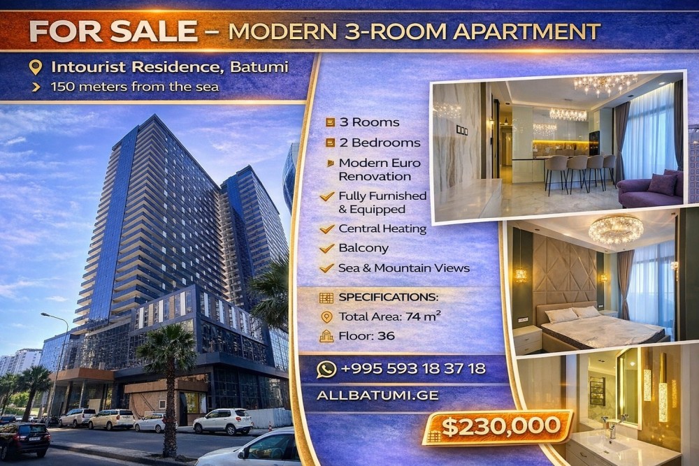 For Sale ! იყიდება 3 ოთახიანი ბინა ბათუმში, ფიროსმანის 17, ინტურისტ რეზიდენსში, ზღვიდან 150 მეტრში, თანამედროვე რემონტით, მოწყობილია ავეჯით ტექნიკით, ცენტრალური გათბობით, აივნით. 2 სვ წერტილით, ზღვის და მთის ხედებით